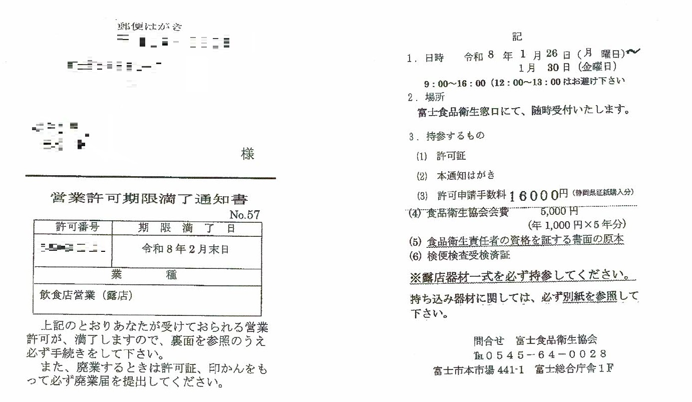 営業許可の有効期限が近づくと、保健所からこのような**「営業許可期限満了通知書(はがき)」**が送られてきます。