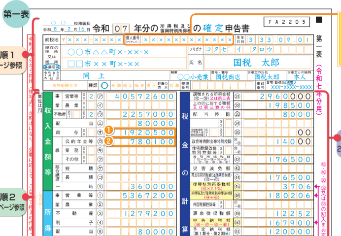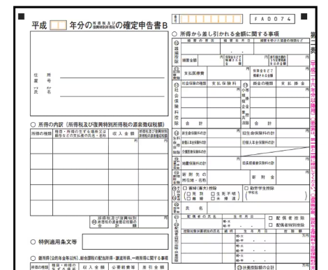 所得税の確定申告書の第一表、二表と青色又は白色所得税申告決算書1~5ページ (必要年度分)